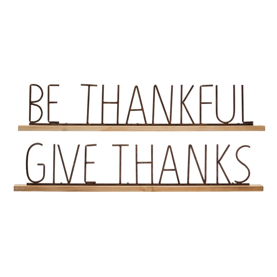 Celebrate the autumn season with these expertly crafted Metal Mantel Fall Phrase Signs. Combining durable metal and warm wood, each sign features heartfelt messages—"BE THANKFUL" and "GIVE THANKS"—to inspire gratitude and cozy ambiance in your living space. Designed to complement seasonal decor effortlessly, these signs serve as timeless reminders of appreciation and togetherness in any home setting.