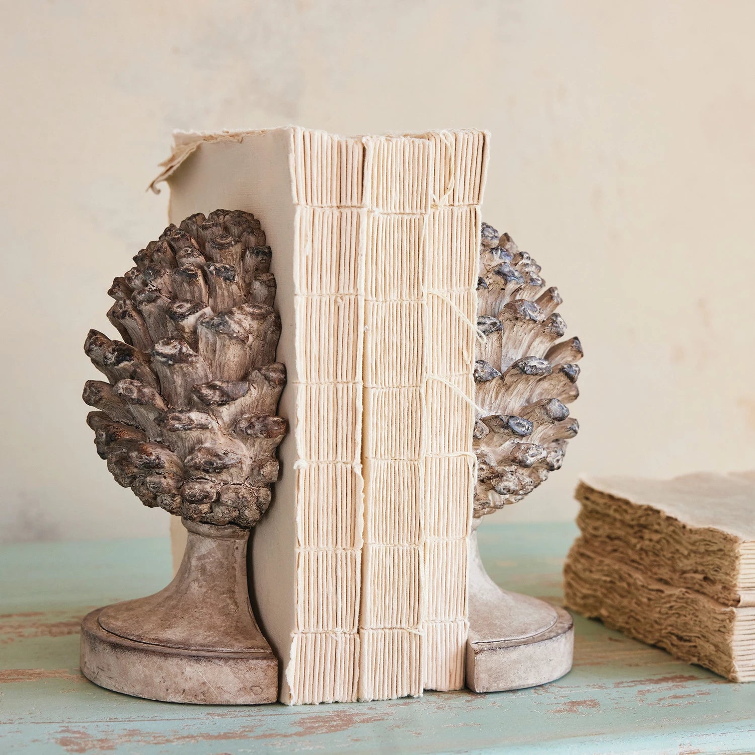 These pinecone-shaped finial bookends, crafted from resin with a distressed brown and gray finish, bring an authentic rustic touch to your living space. Each piece features unique variations, enhancing the natural, cabin-inspired aesthetic. Perfect for organizing books while adding charm to cabin, holiday, or rustic decor. Set of 2