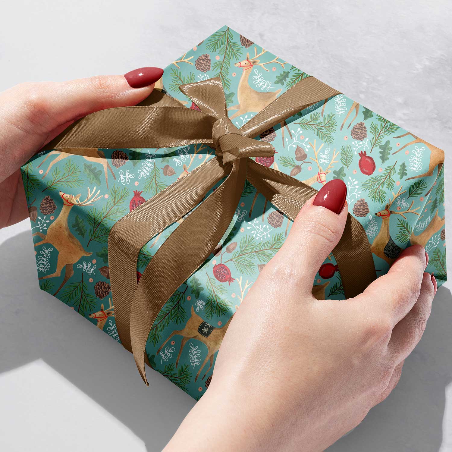 Transform your holiday presentations with this sophisticated gift wrap, showcasing an elegant reindeer tapestry pattern adorned with lustrous metallic teal accents. This premium offering combines environmental stewardship with refined aesthetics—constructed from a conscientious blend of 20% post-consumer recycled content and 80% FSC-certified fibers sourced from responsibly managed forests. Manufactured in Italy with exacting standards, the 10 ft x 30" roll delivers exceptional paper quality and printing precision, ensuring your gifts reflect both your discerning taste and commitment to sustainable practices.