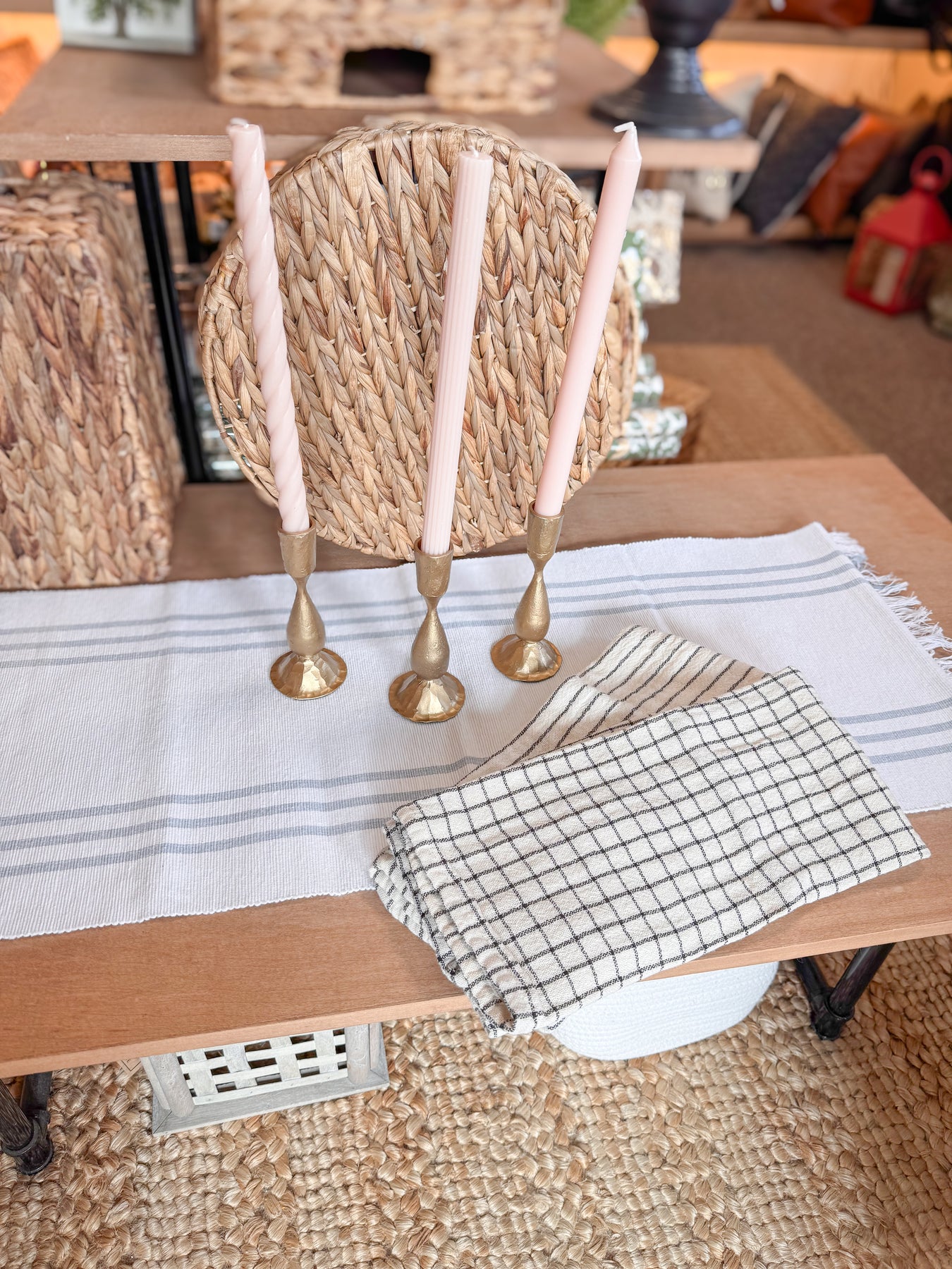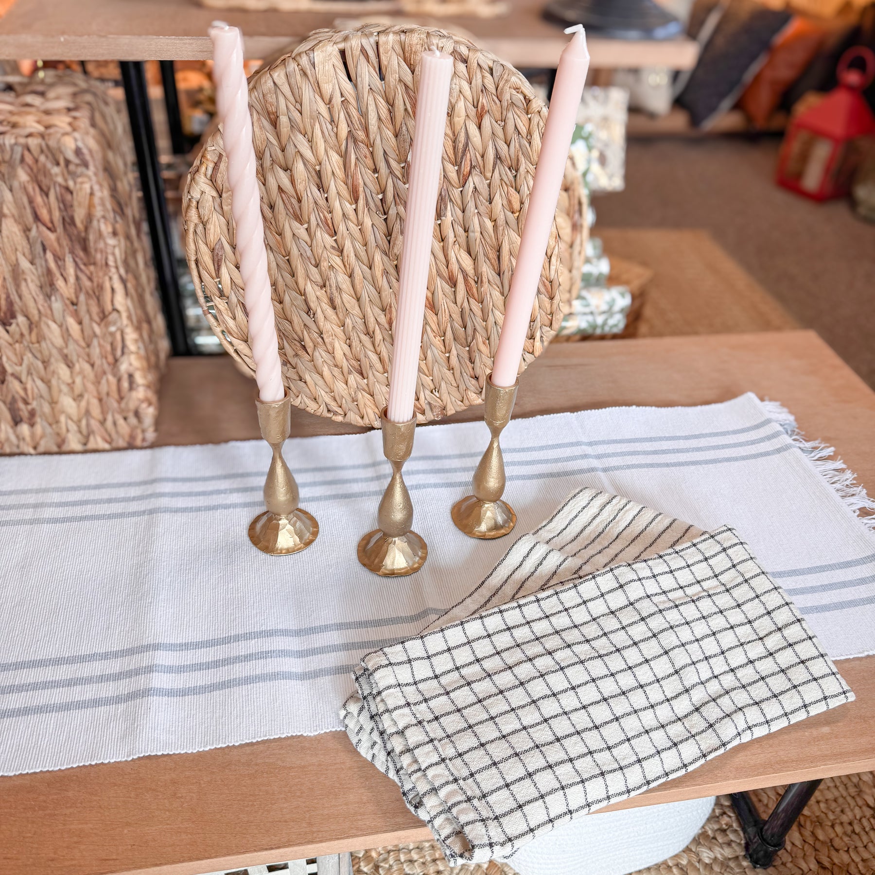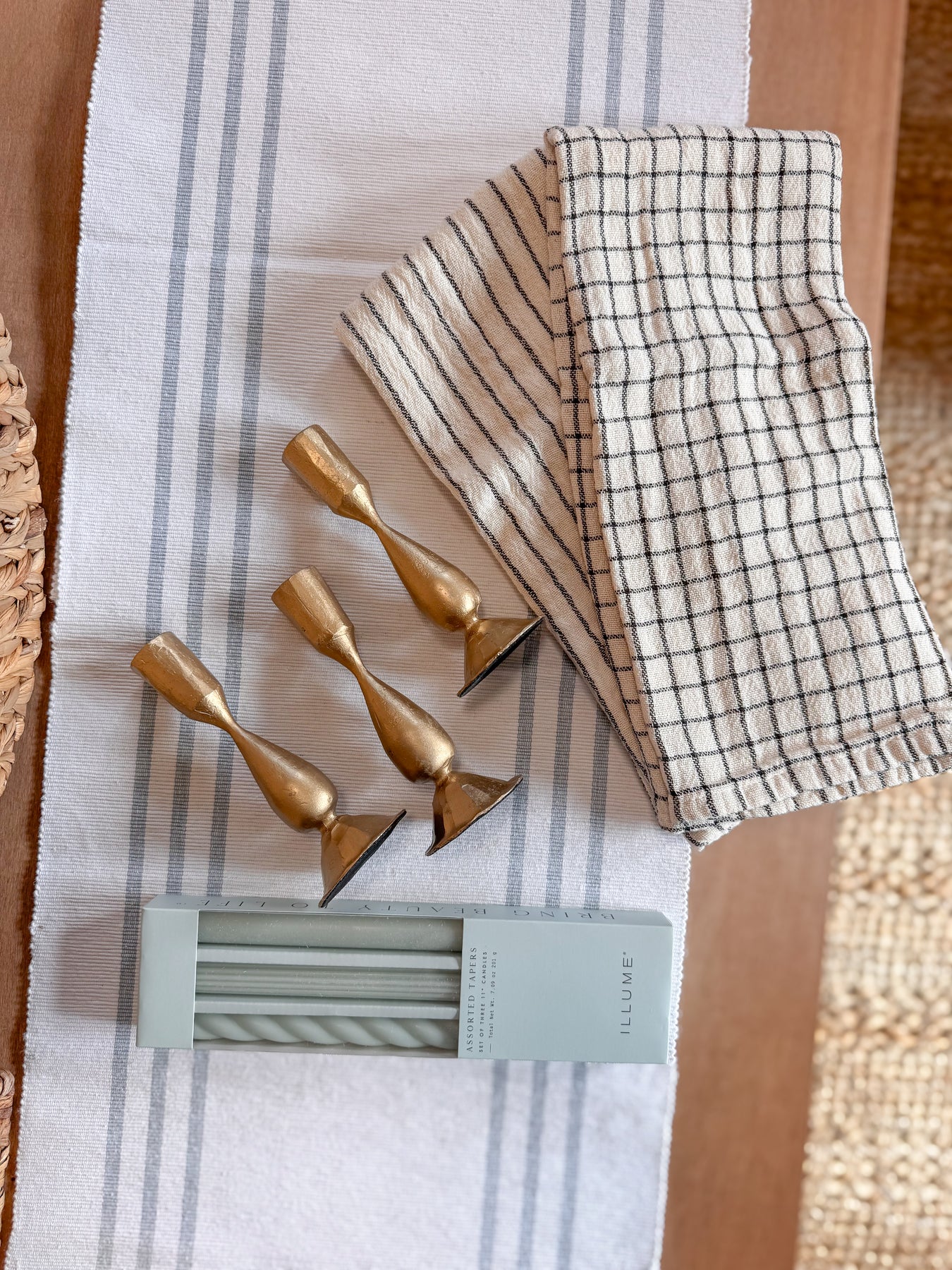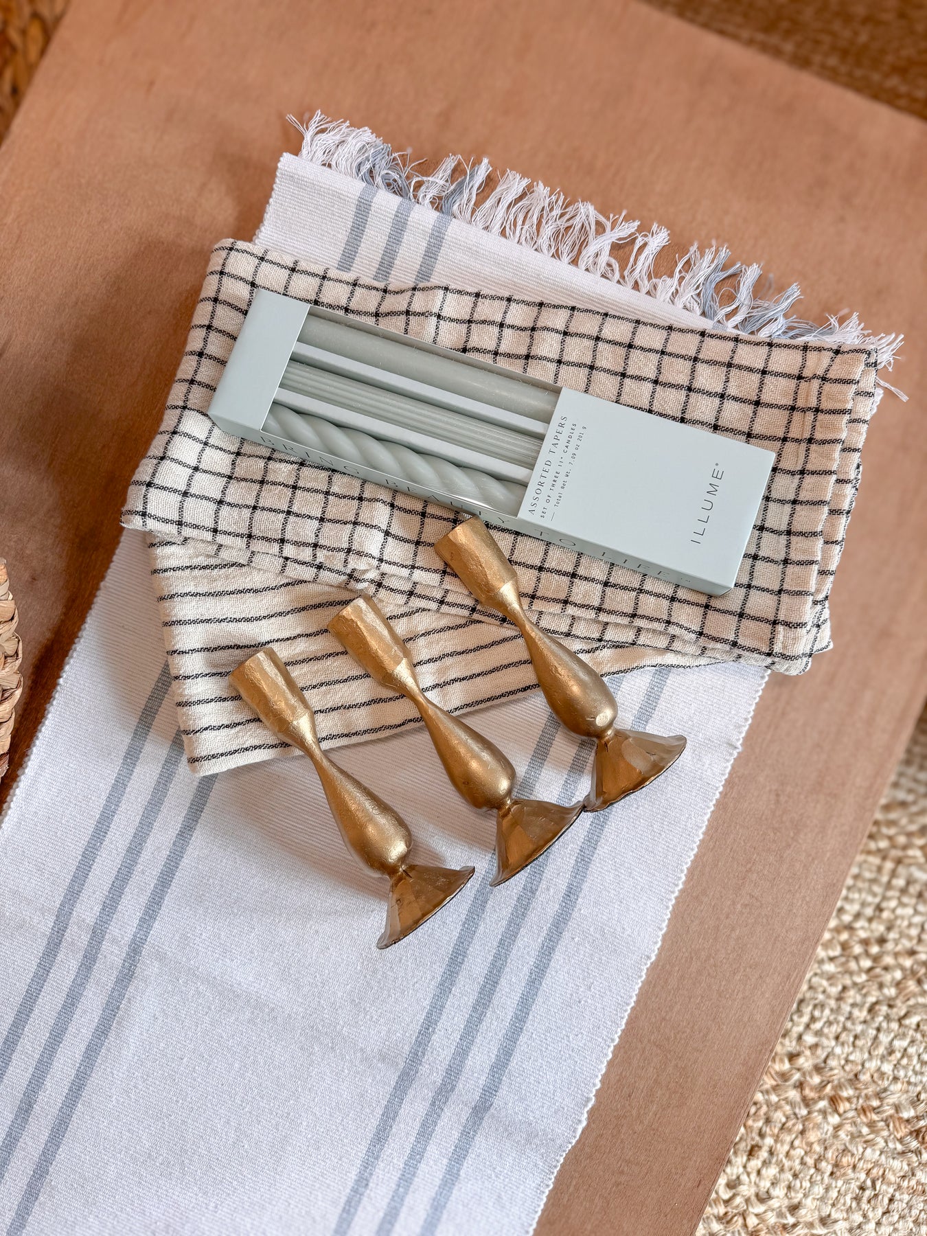 Featuring a timeless blue striped runner, antique gold metal taper holders, and your choice of candle colors and tea towel style, this set blends classic charm with modern refinement.