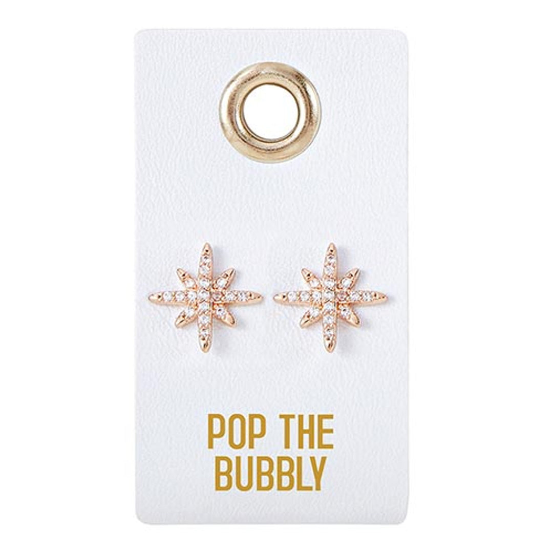 "Pop the Bubbly" Spark Gem Stud Earrings Leather Gift Tag