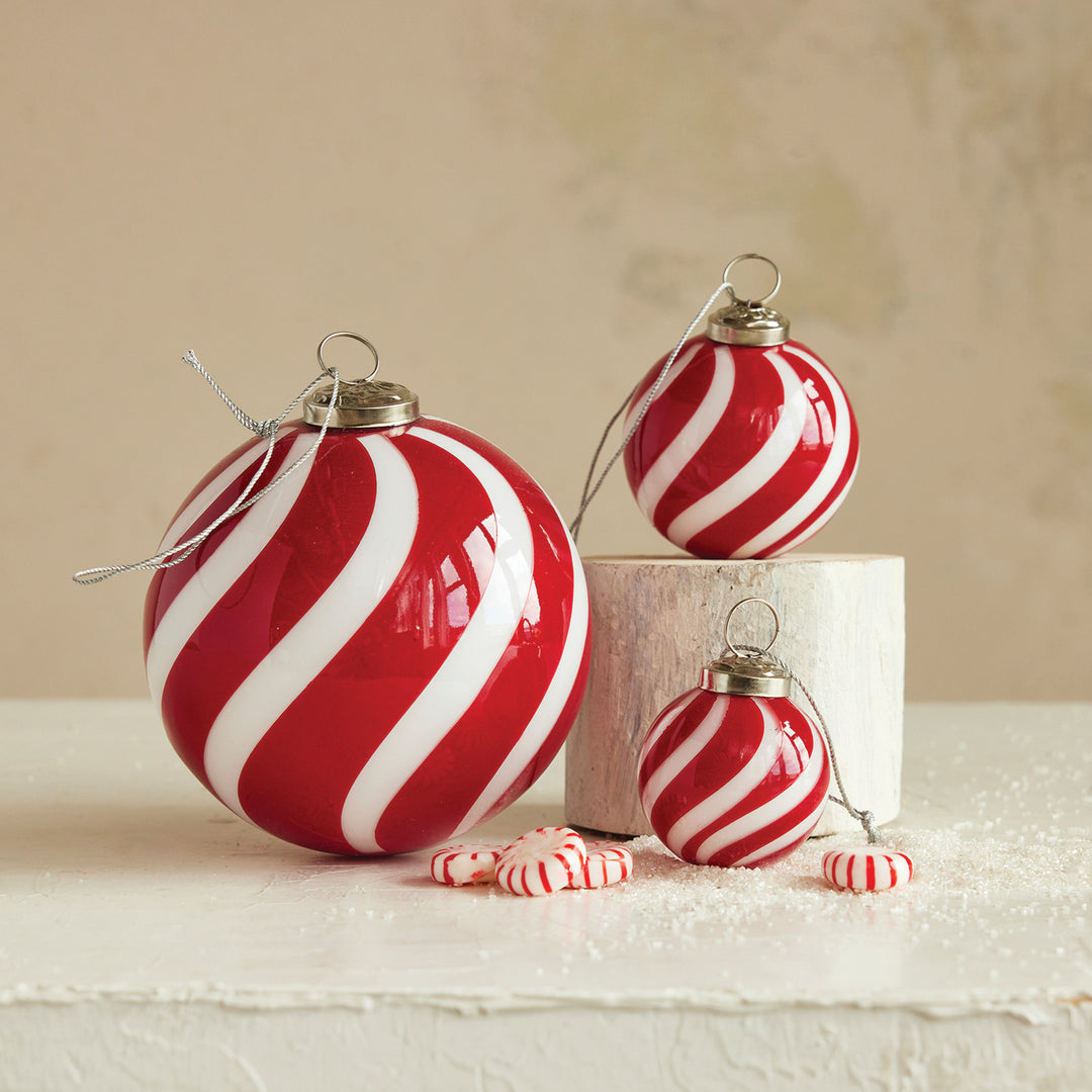 Hand-Blown Glass Ball Swirled Stripe Ornament, Red + White