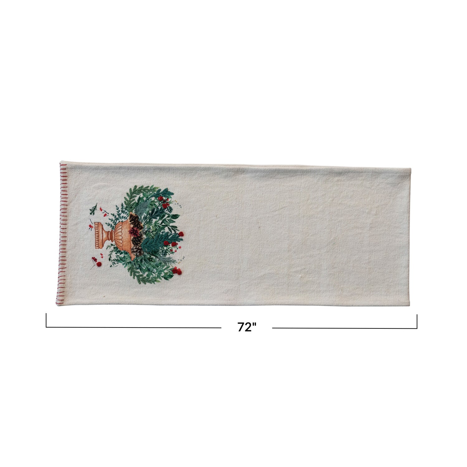 This 72" Floral Urn Canvas Printed Runner showcases an exquisite watercolor design, enhanced by intricate hand-embroidered accents. Crafted for the holiday season, it adds refined artistry and texture to your table setting, elevating festive decor with a balance of delicate detail and durable canvas quality.