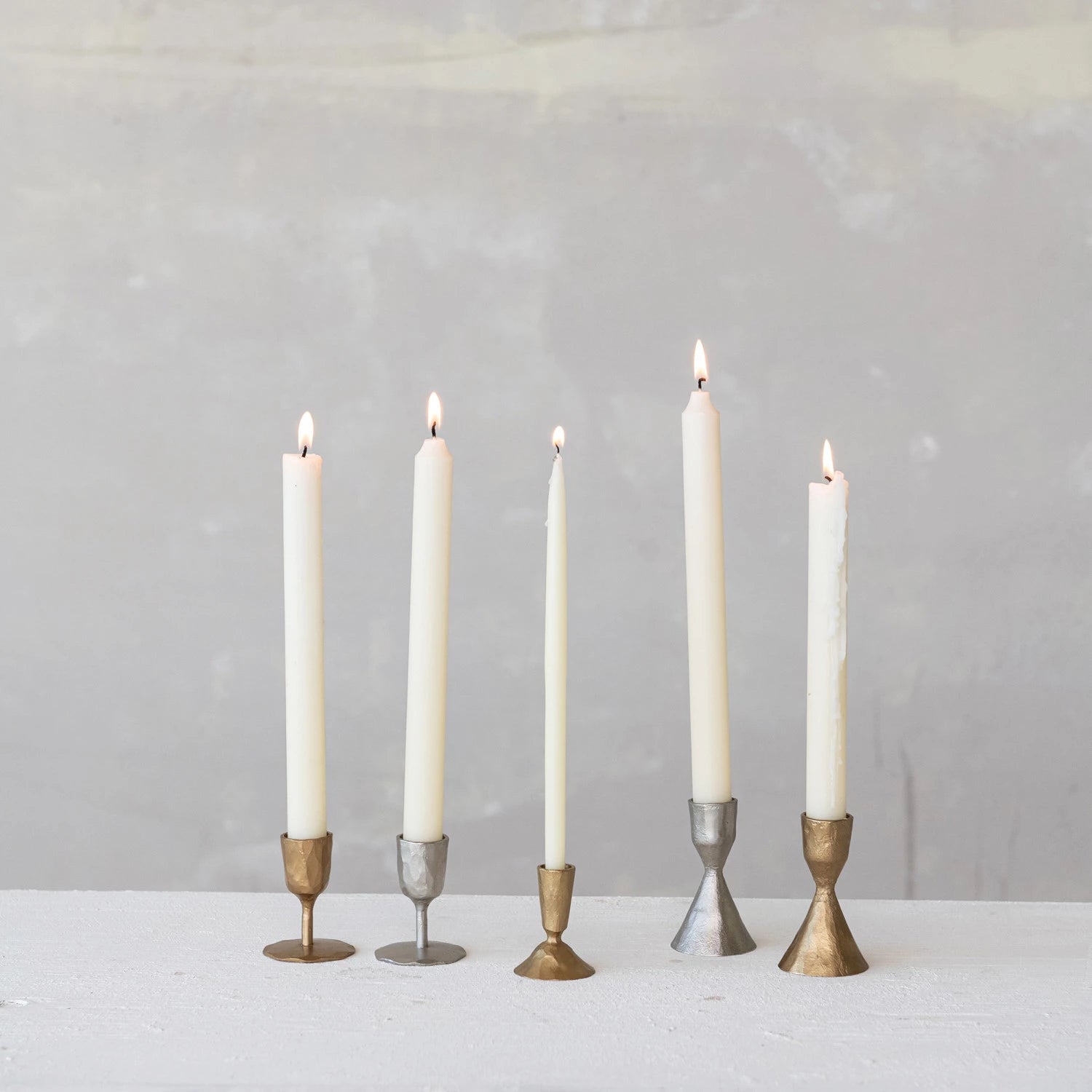 Handcrafted cast iron taper holder designed for 1/2" taper candles. Each piece is individually forged to create a sturdy, heirloom-quality accessory with authentic character. The compact 2 1/4" profile fits seamlessly into intimate spaces while the antique brass finish adds warmth to any décor. Perfect for layering candlelight in smaller rooms or as part of a curated candle collection.