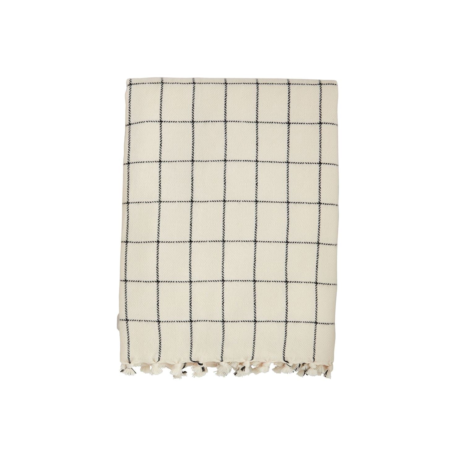 Our Dark Stripe Check Blanket features a timeless windowpane design in a soft neutral base with dark woven stripes. The tied tassel fringe hem adds texture and movement, making it a beautiful layering piece for any season.