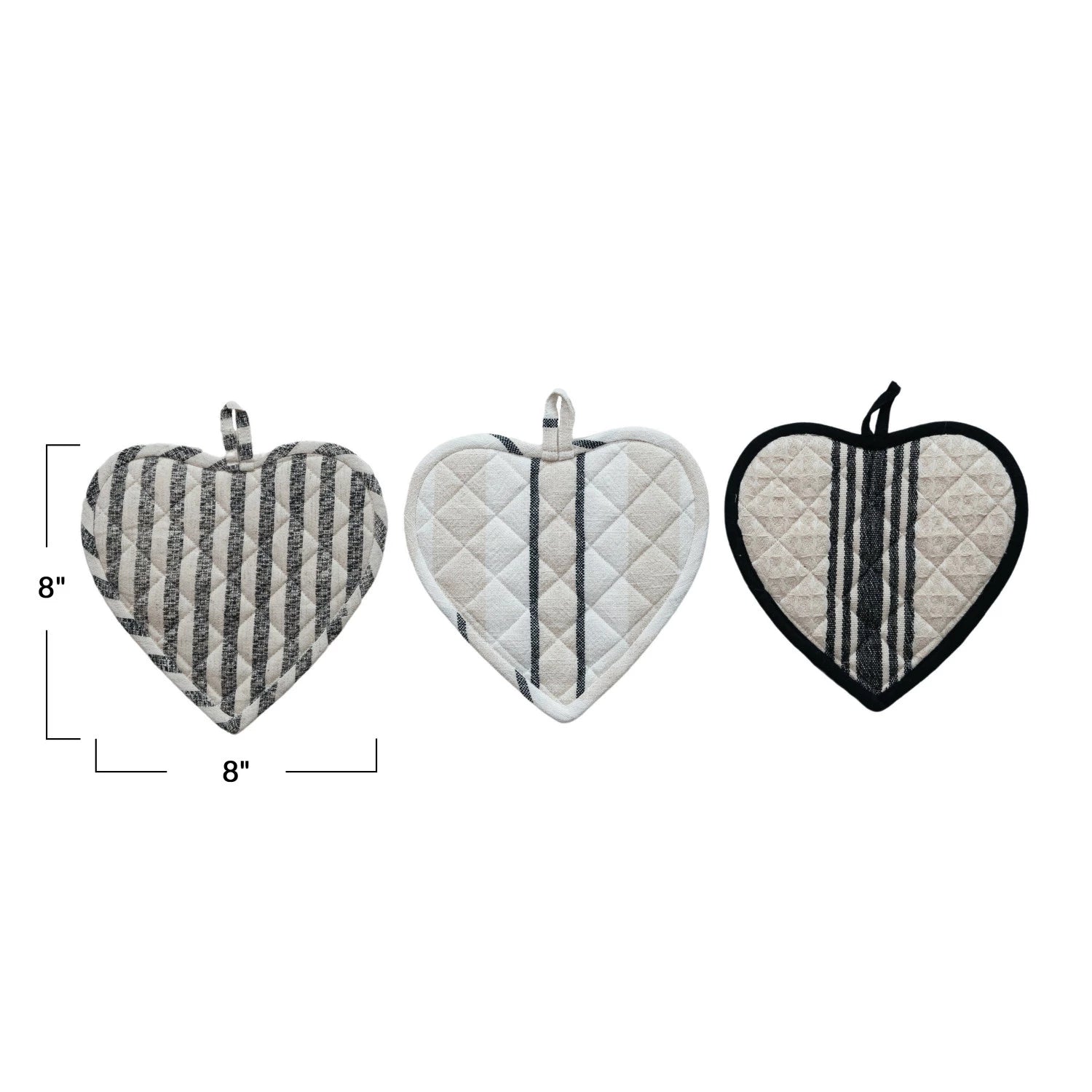 Protect your hands in style with this quilted cotton pot holder, expertly crafted with a charming heart shape. Available in three distinctive striped patterns, each design combines functionality with aesthetic appeal—perfect for everyday kitchen use or as a thoughtful gift. The quilted construction provides reliable heat protection while the premium cotton fabric ensures durability through countless uses. A versatile kitchen essential that marries practicality with refined design.