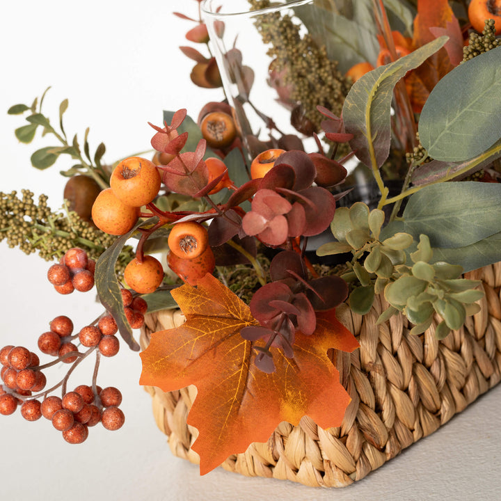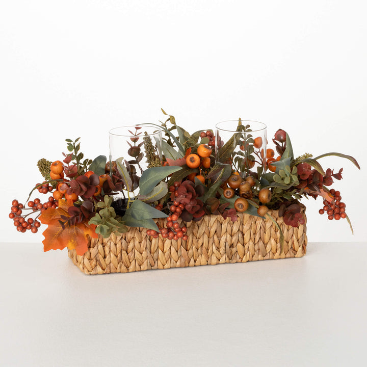 Bring warmth and seasonal charm to your space with this Fall Centerpiece Candle Holder. Featuring a woven hyacinth basket filled with mixed foliage, vibrant leaves, berries, and rich oranges, reds, and greens, it creates a cozy, inviting atmosphere. Perfect for autumn gatherings, this centerpiece adds natural beauty and a comforting glow to any table setting.